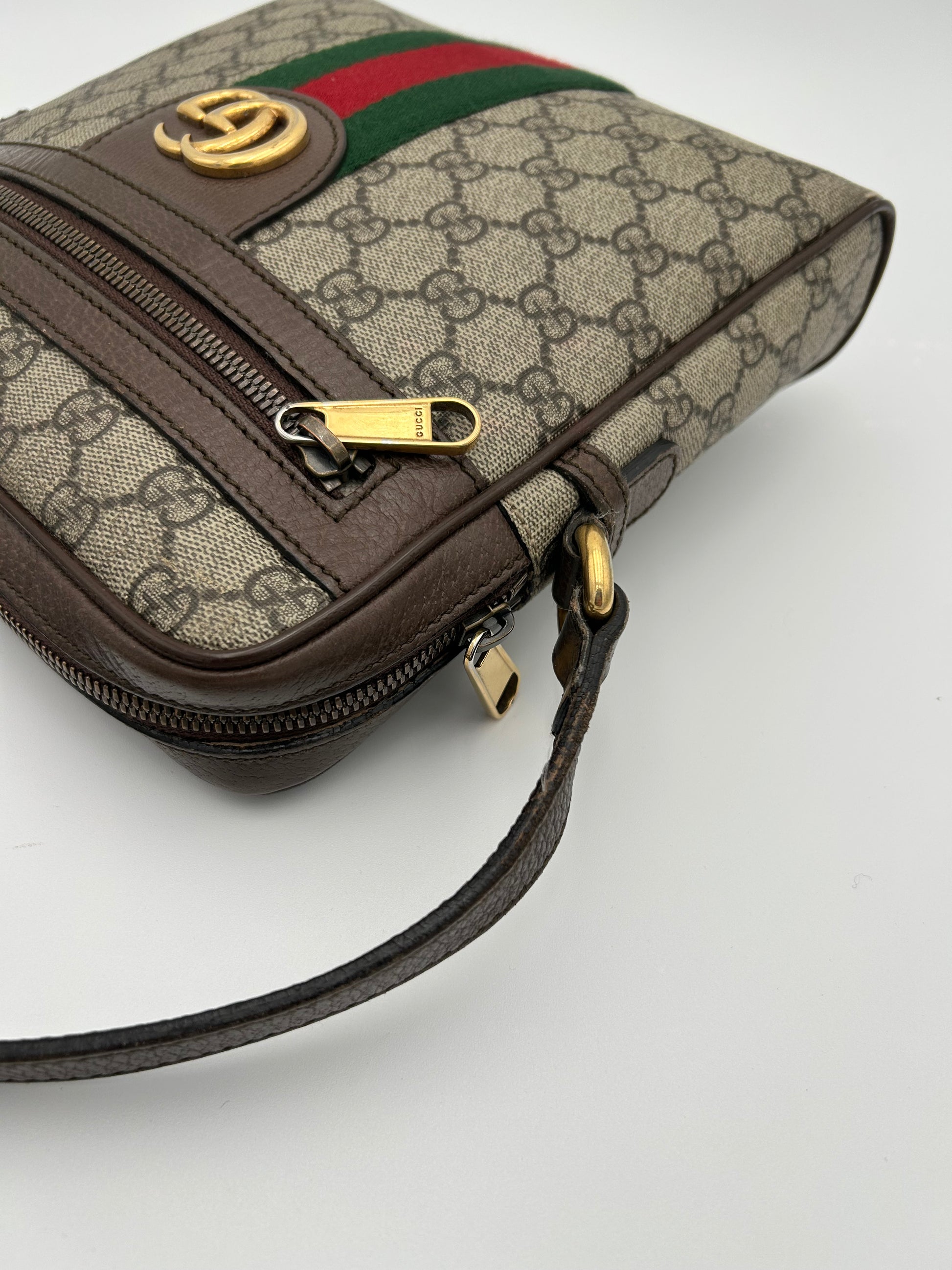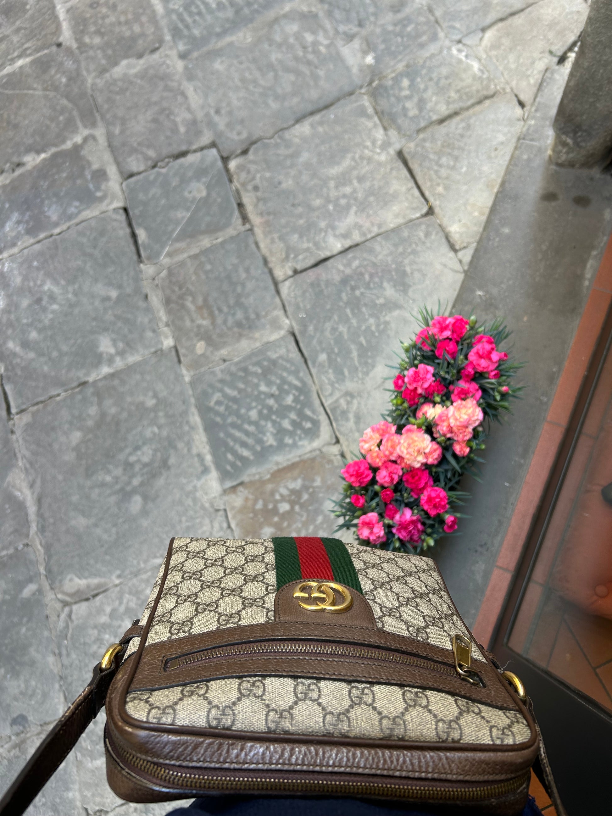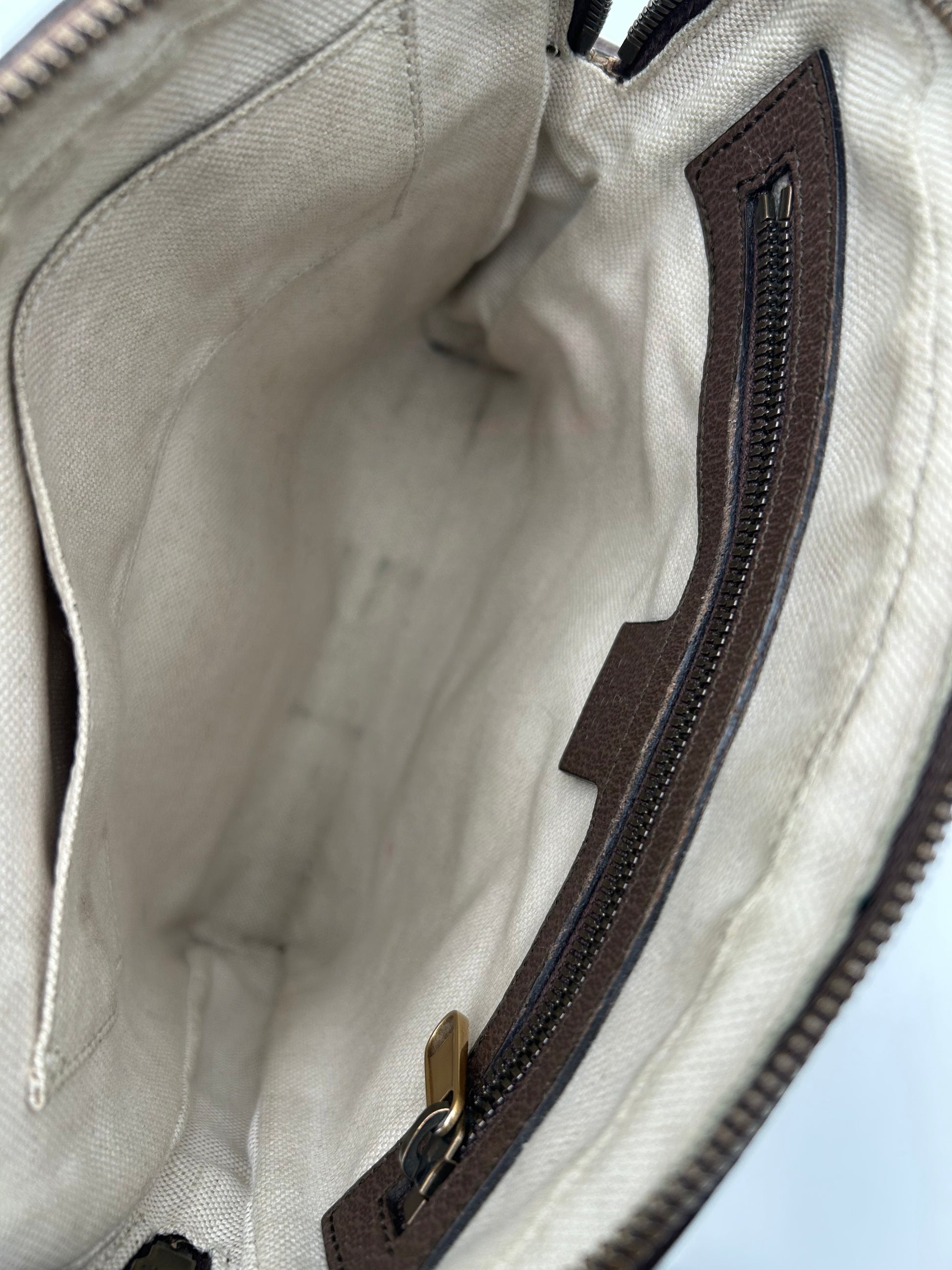 Second-hand Gucci Ophidia bag in GG canvas and brown leather with gold hardware and adjustable shoulder strap.