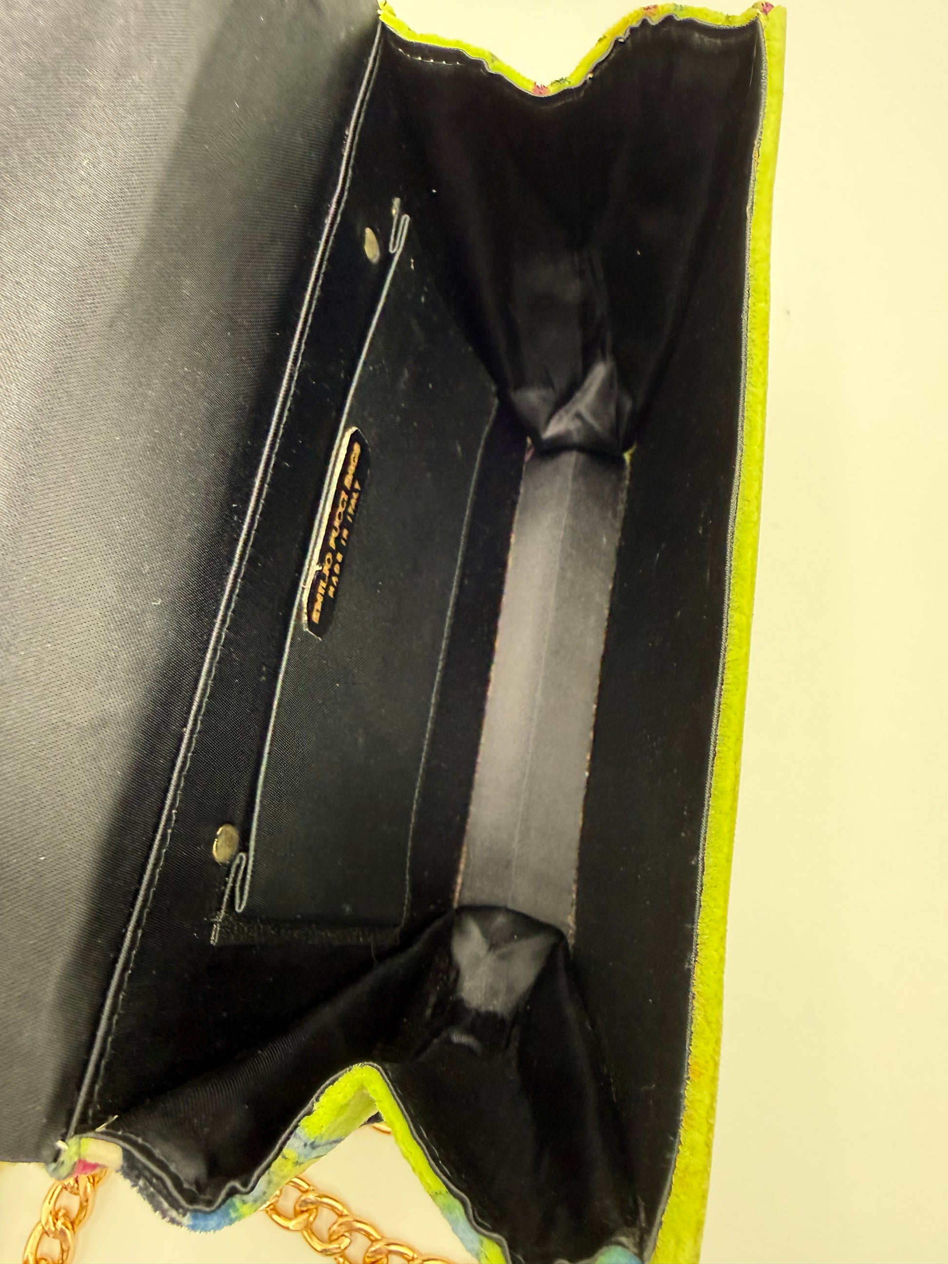 - Green velvet bag with floral pattern and lightweight gold metal chain. Black satin interior in good condition as shown in photos.