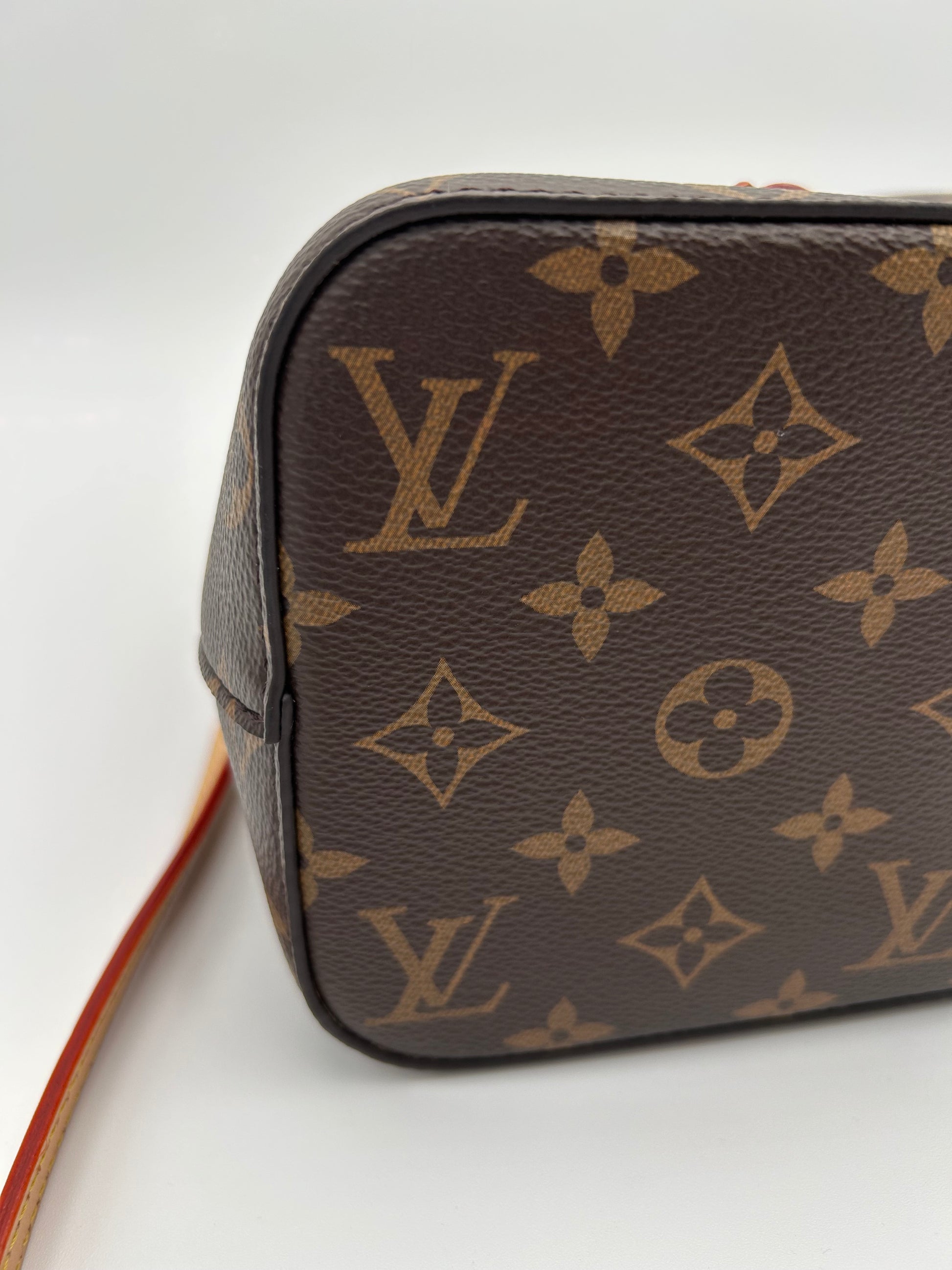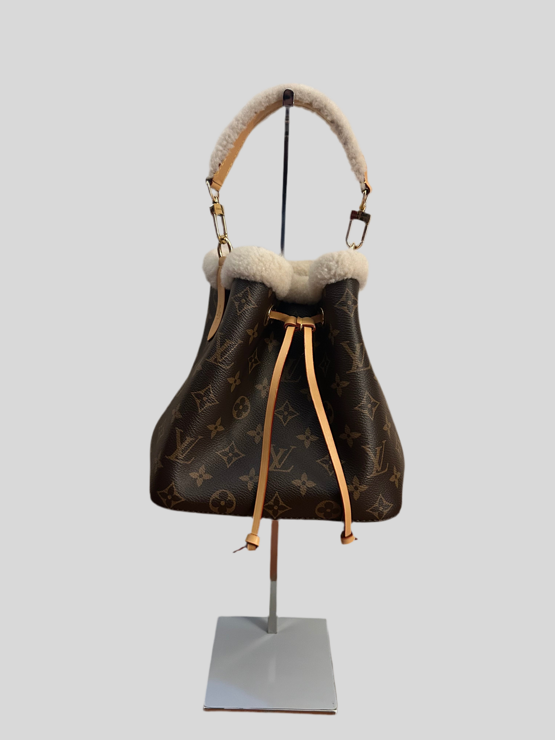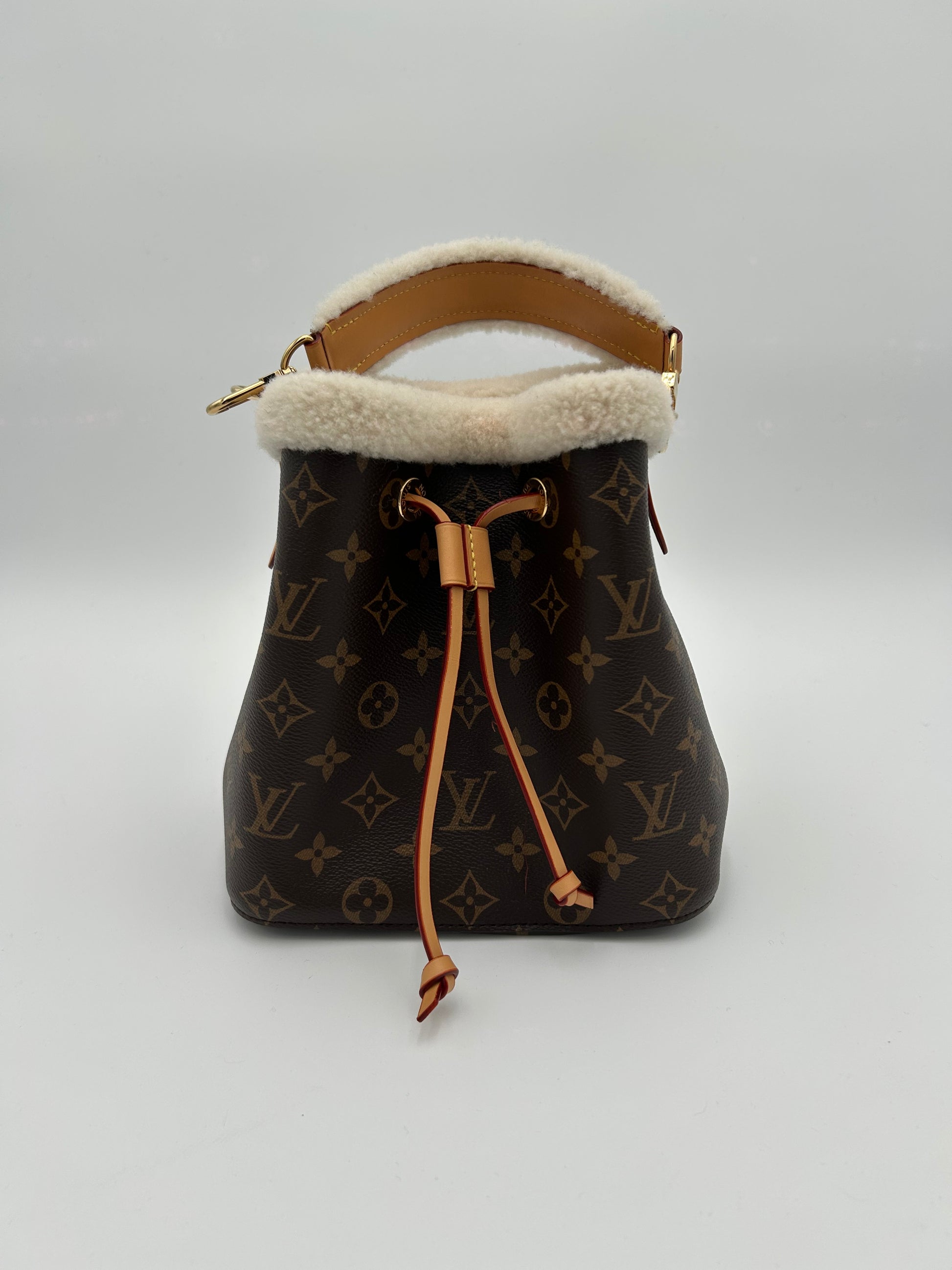 Limited edition Neo Noe BB in brown monogram canvas and white sherpa, beige suede interior. Removable handle and shoulder strap.