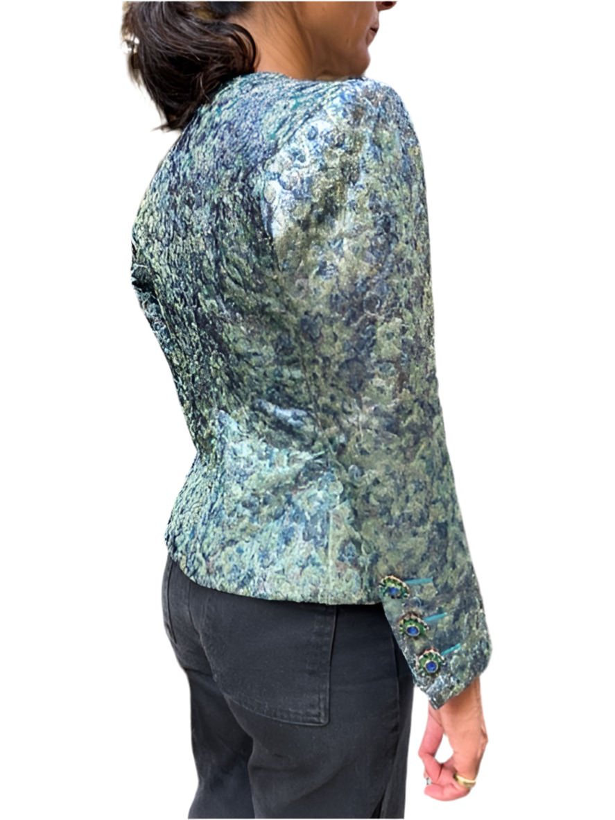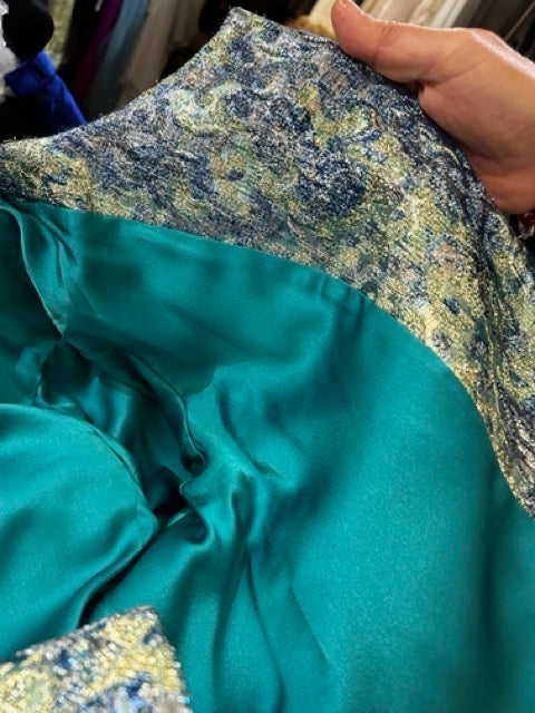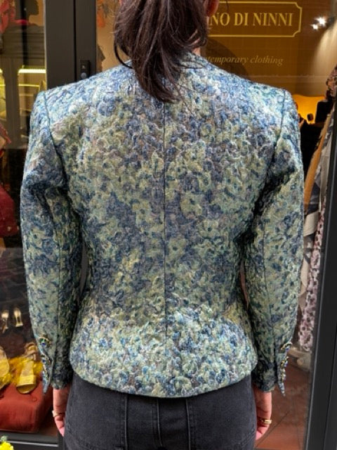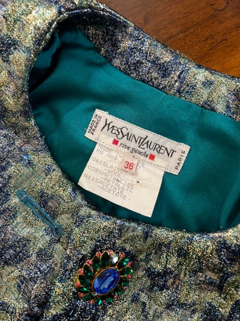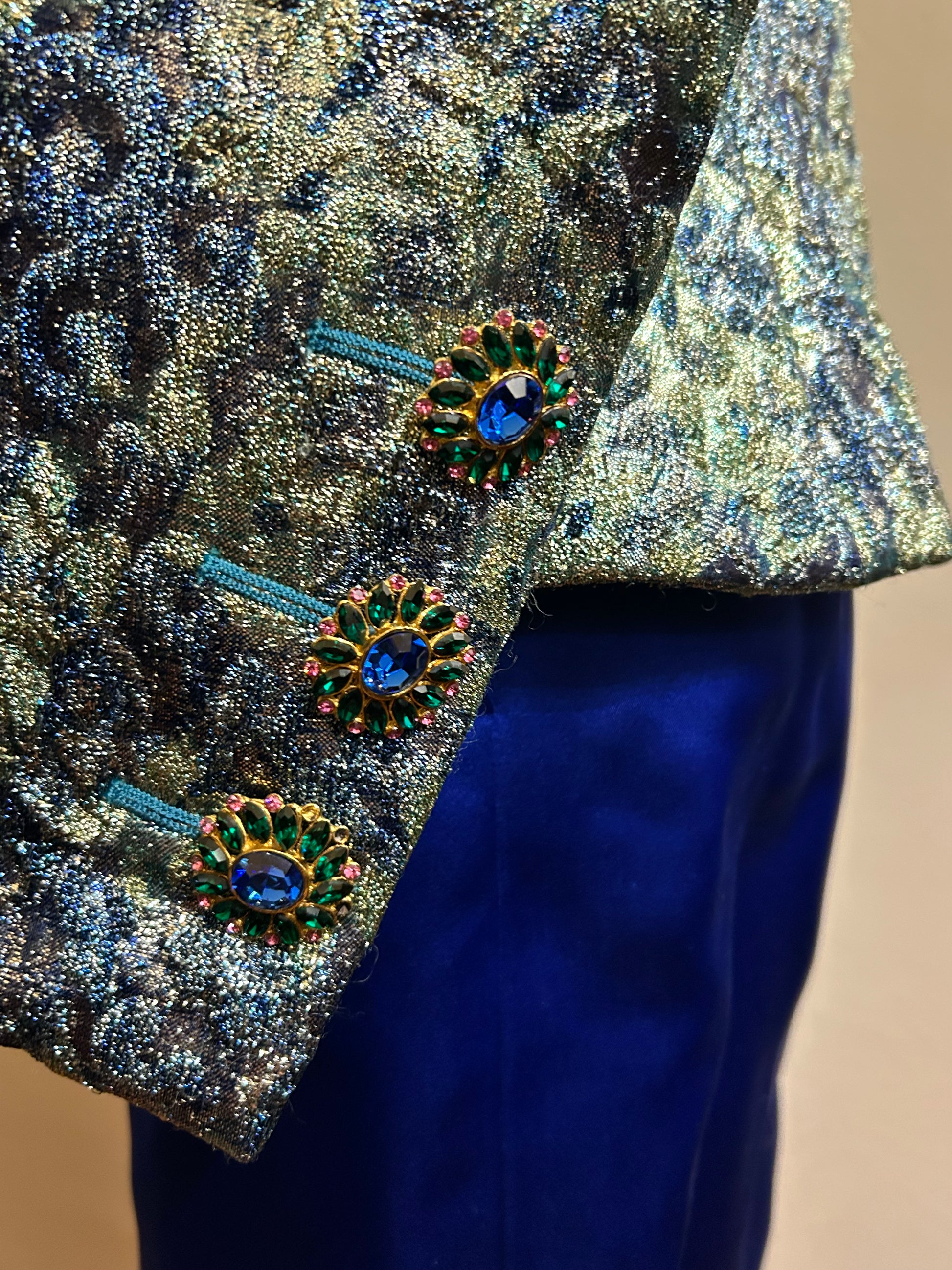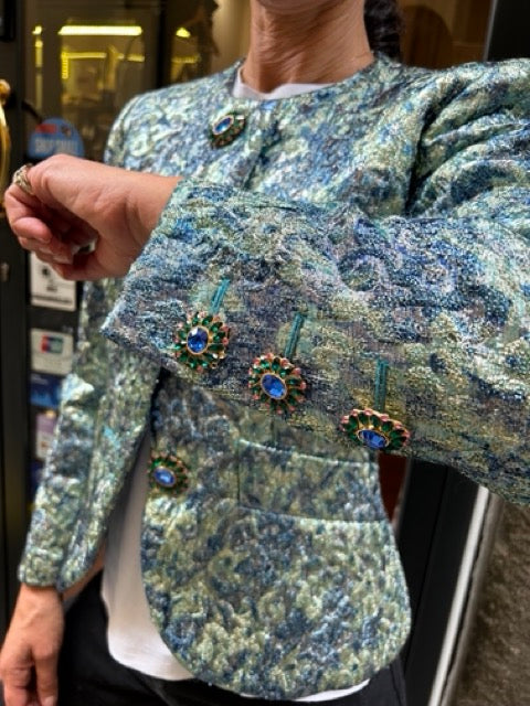 modello sciancrato, motivo a fiori verde, argento e oro. Impreziosita da bottoni gioiello, pezzo molto raro, risale alle collezioni di YSL degli anni 90 ispirata al Marocco.