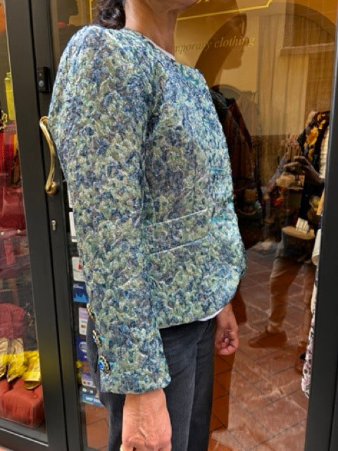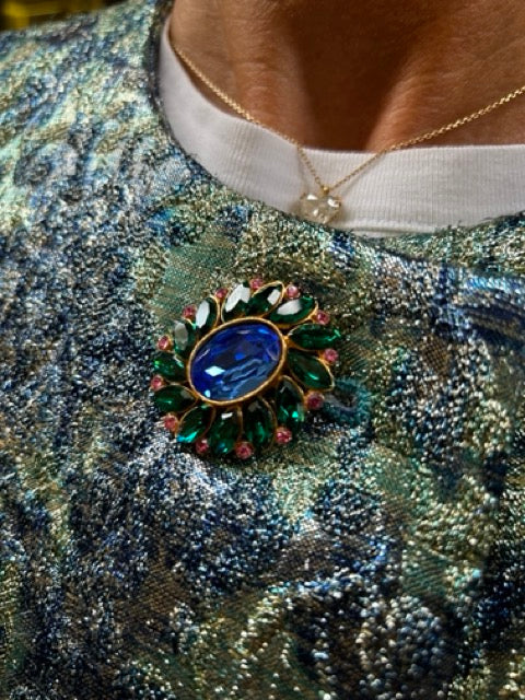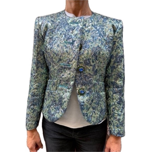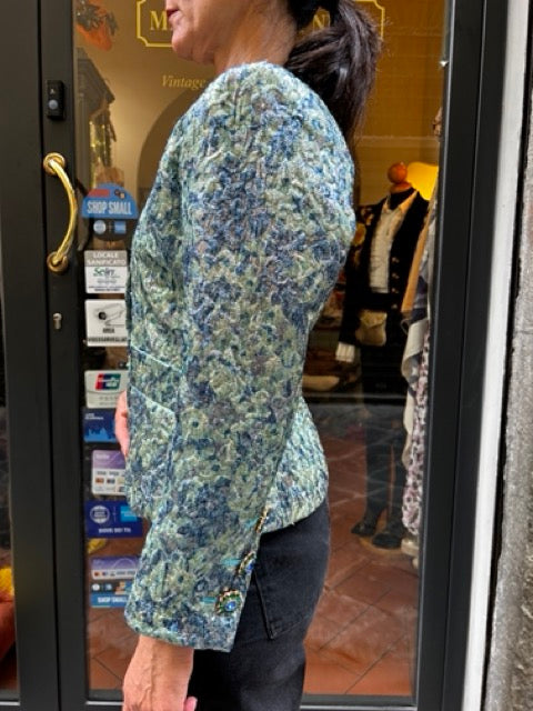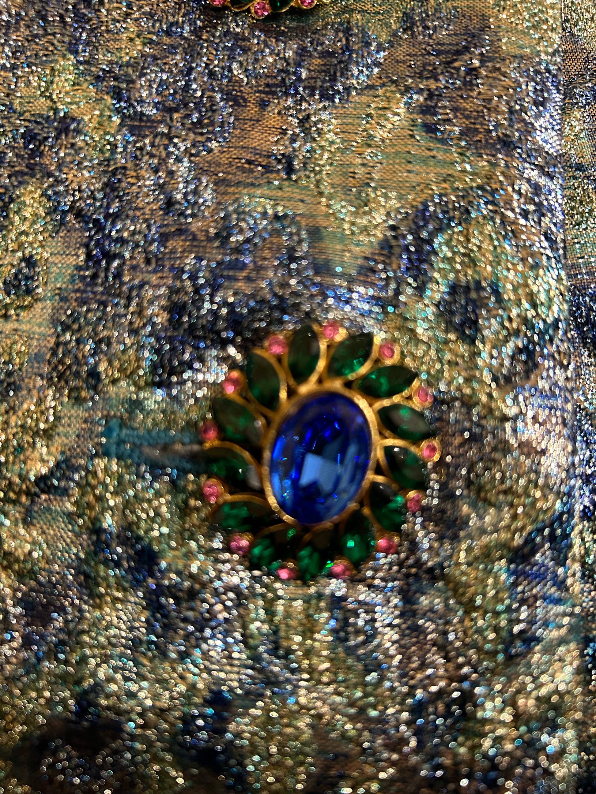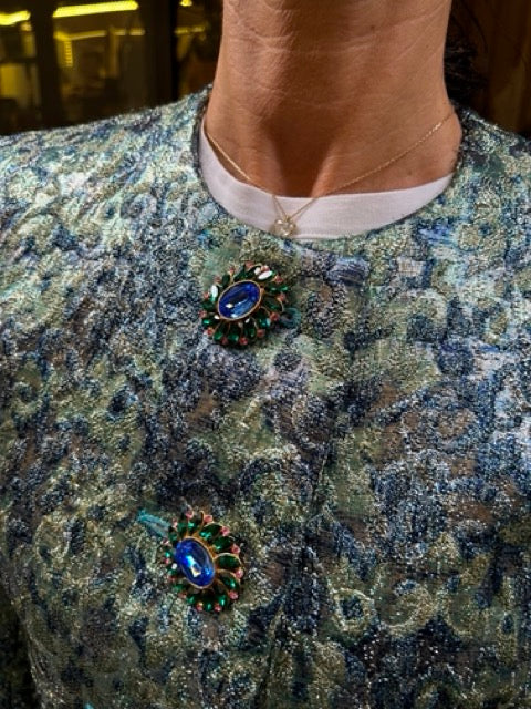 modello sciancrato, motivo a fiori verde, argento e oro. Impreziosita da bottoni gioiello, pezzo molto raro, risale alle collezioni di YSL degli anni 90 ispirata al Marocco.