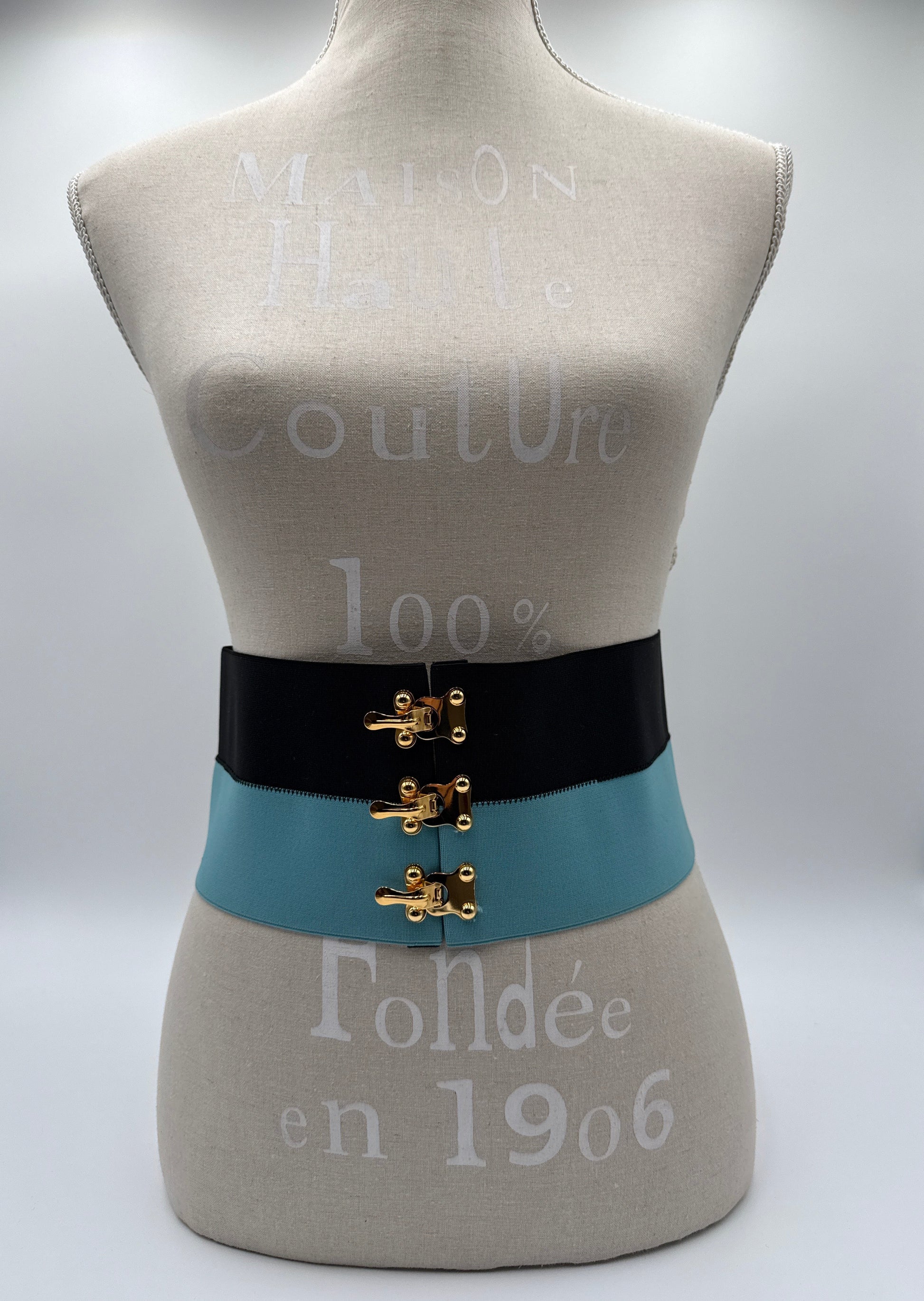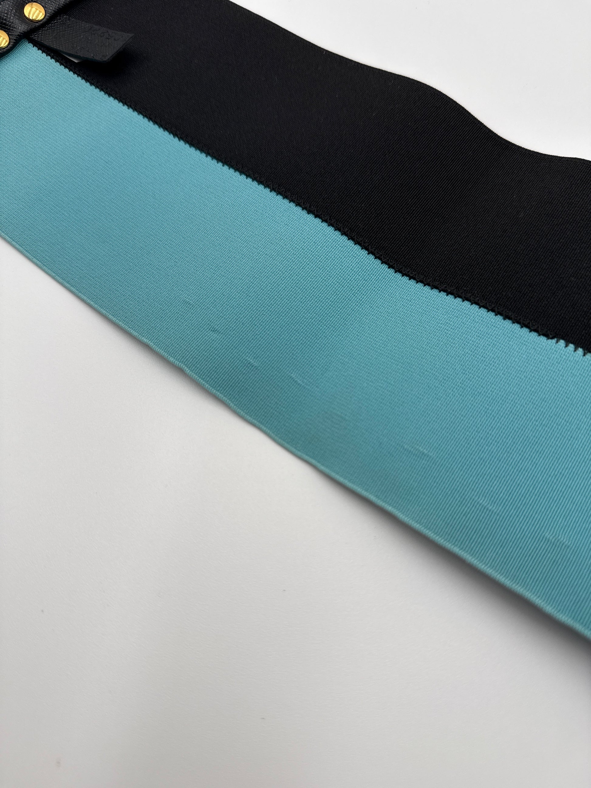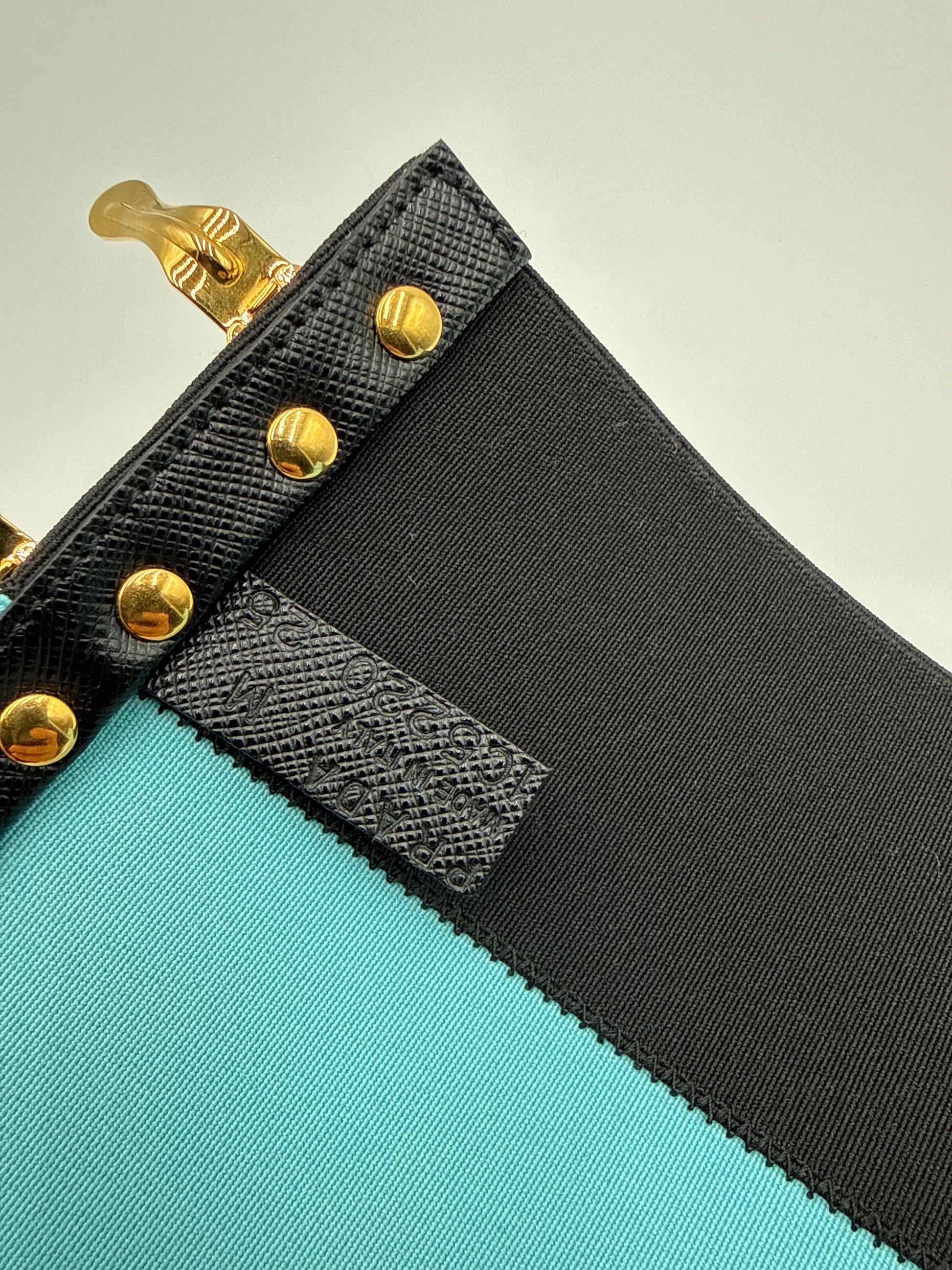 - Materiale tessuto Elastan di cotone bicolore Celeste e Nero con chiusure in metallo dorato