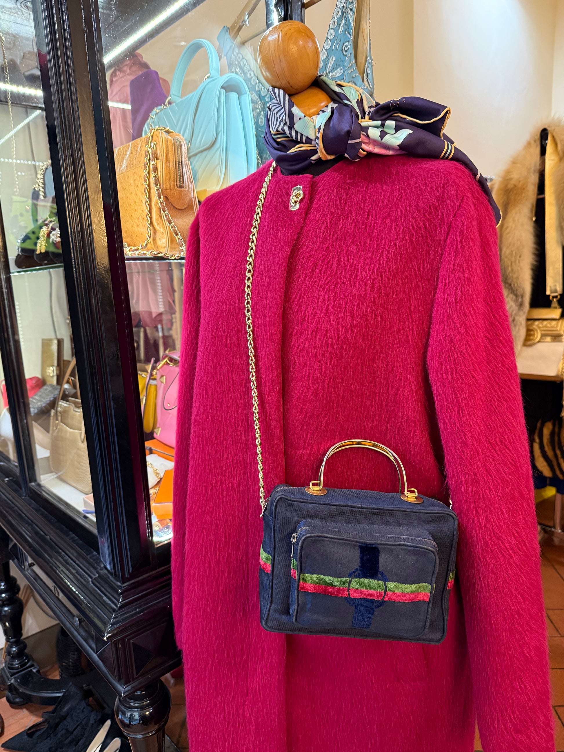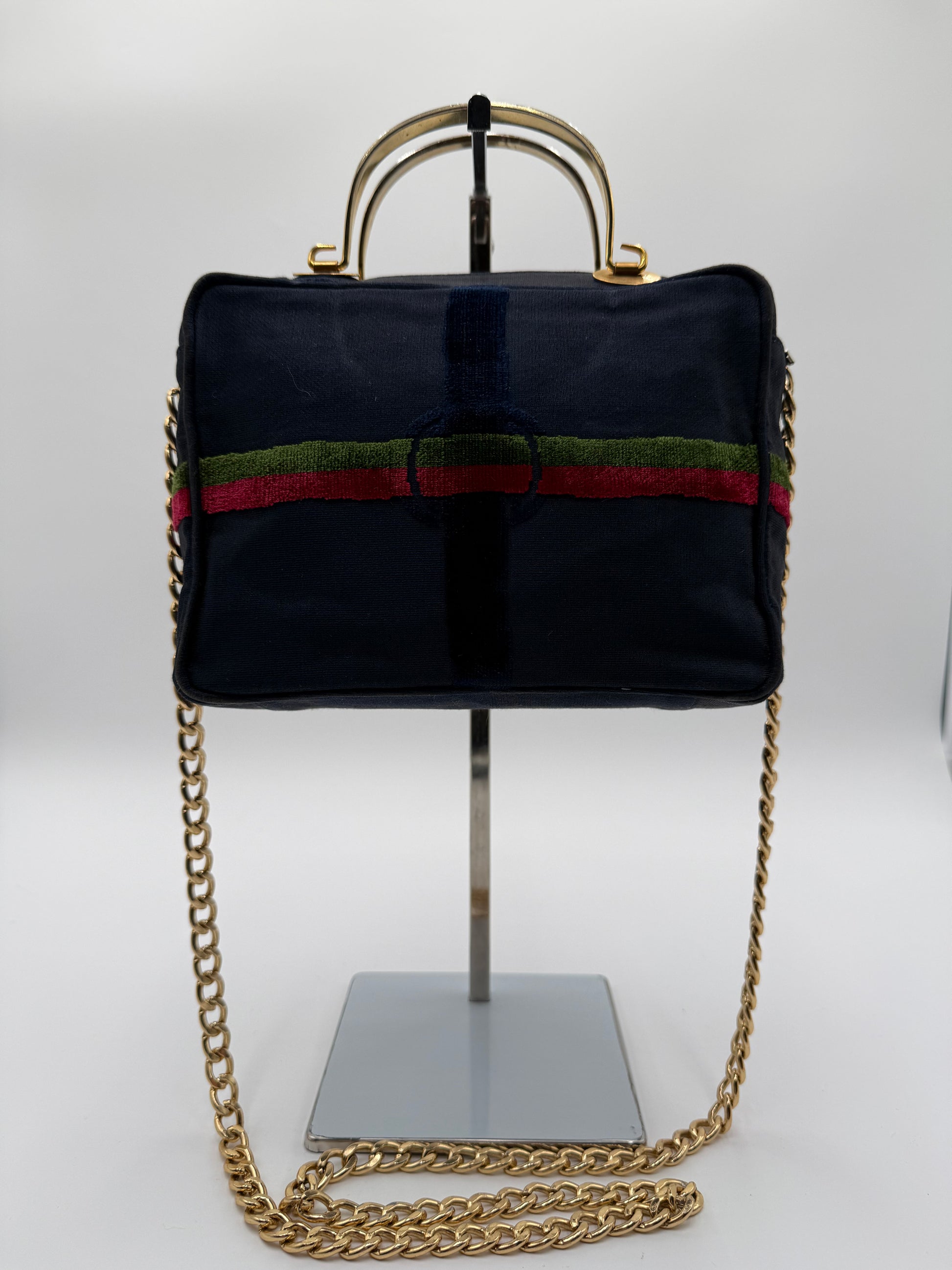 - Materiale tessuto di Tela Blu con Logo Iconico della casa in velluto Verde e Rosso. Interno in Pelle Blu.