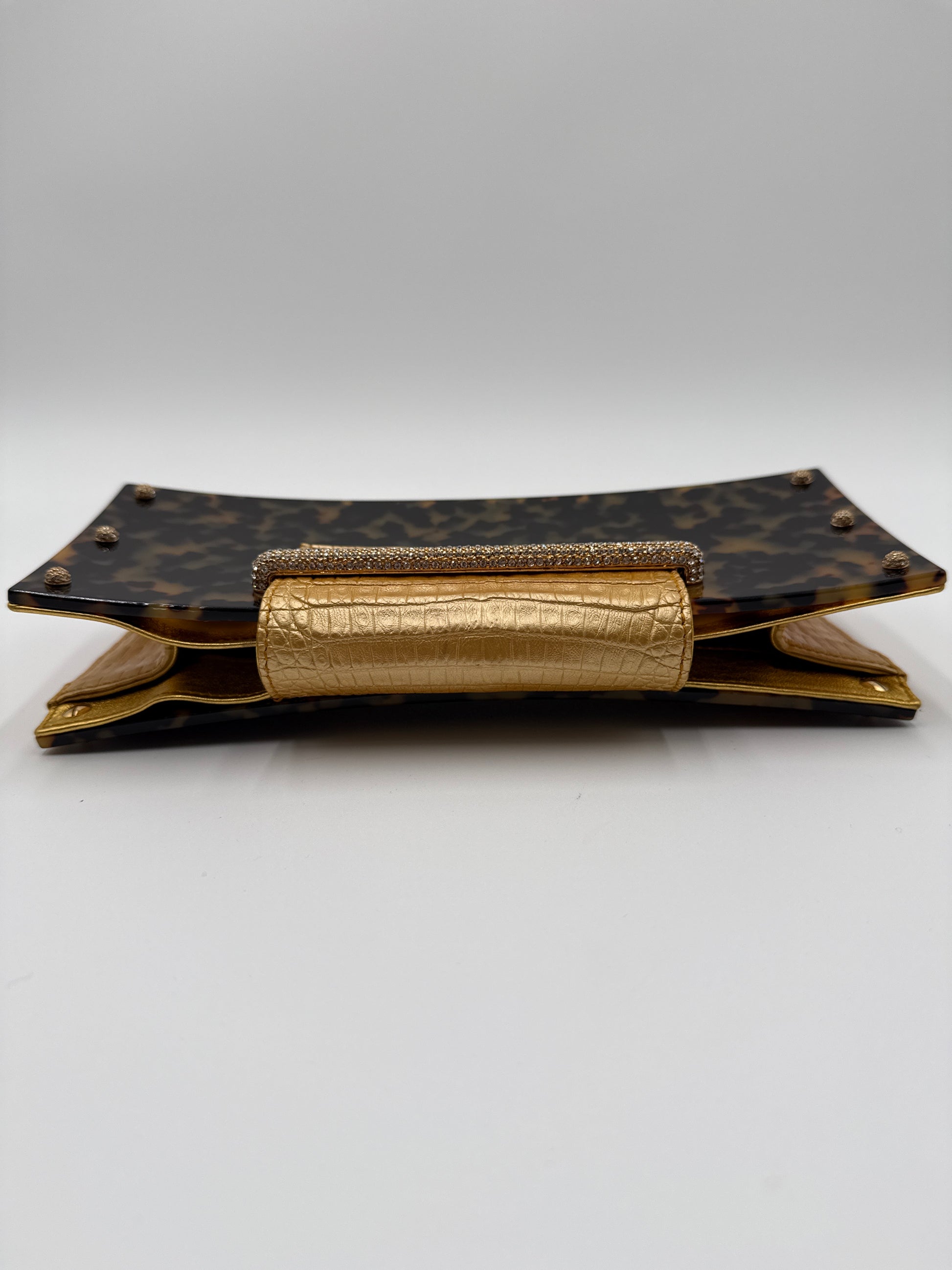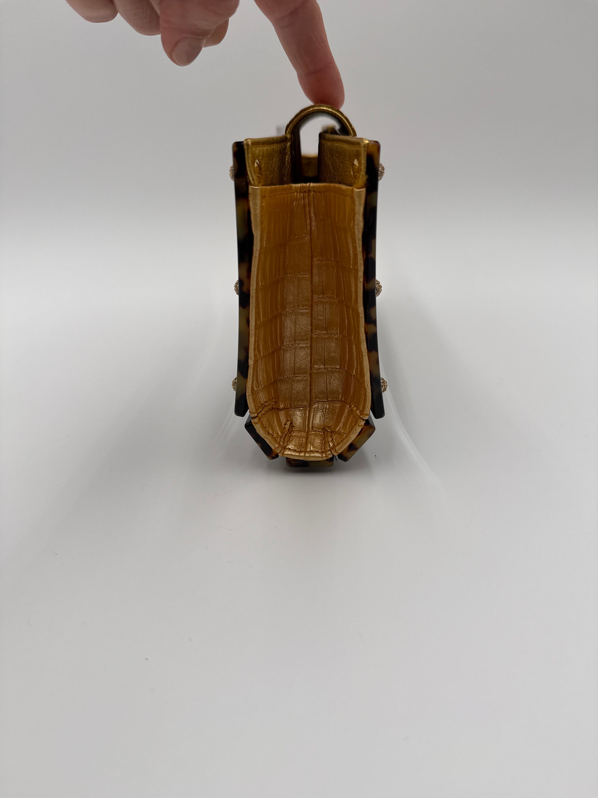 - Materiale finitura a guscio di tartaruga lucida e pelle di coccodrillo dorato, ai lati della borsa e chiusura con patta davanti in coccodrillo e strass di swaroschi vedere foto ,interno nero di raso con una tasca.
